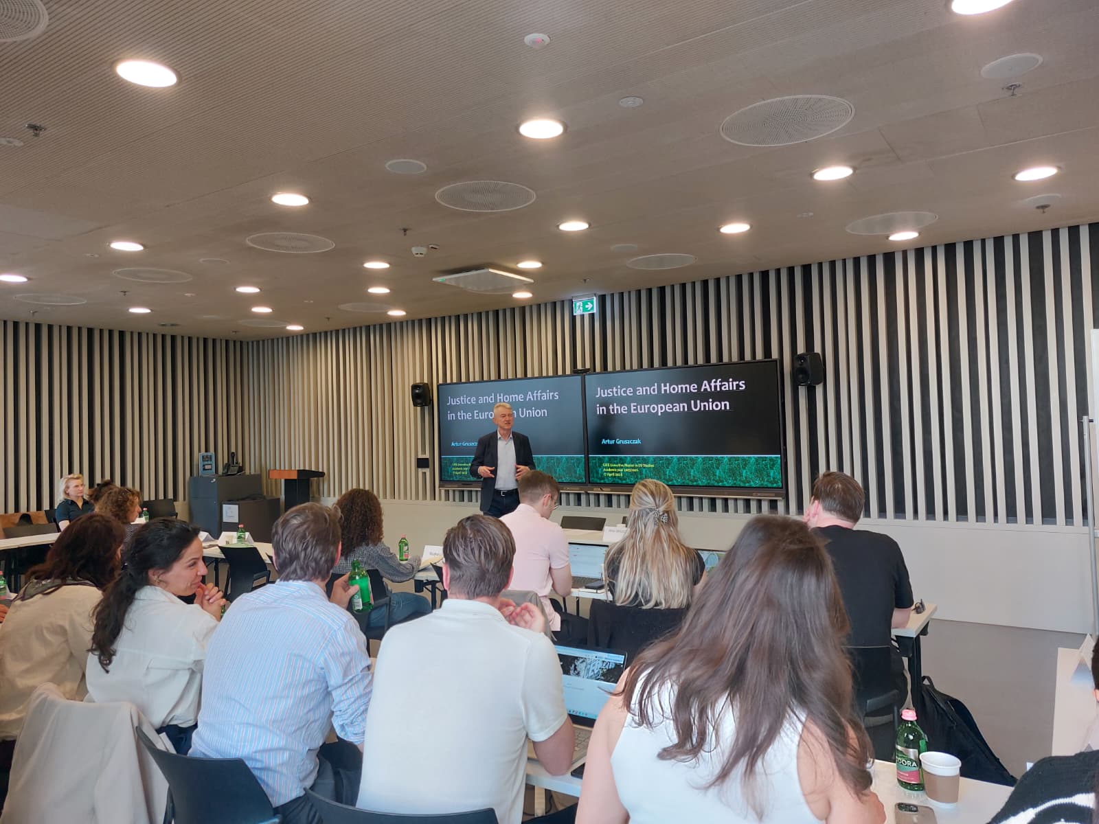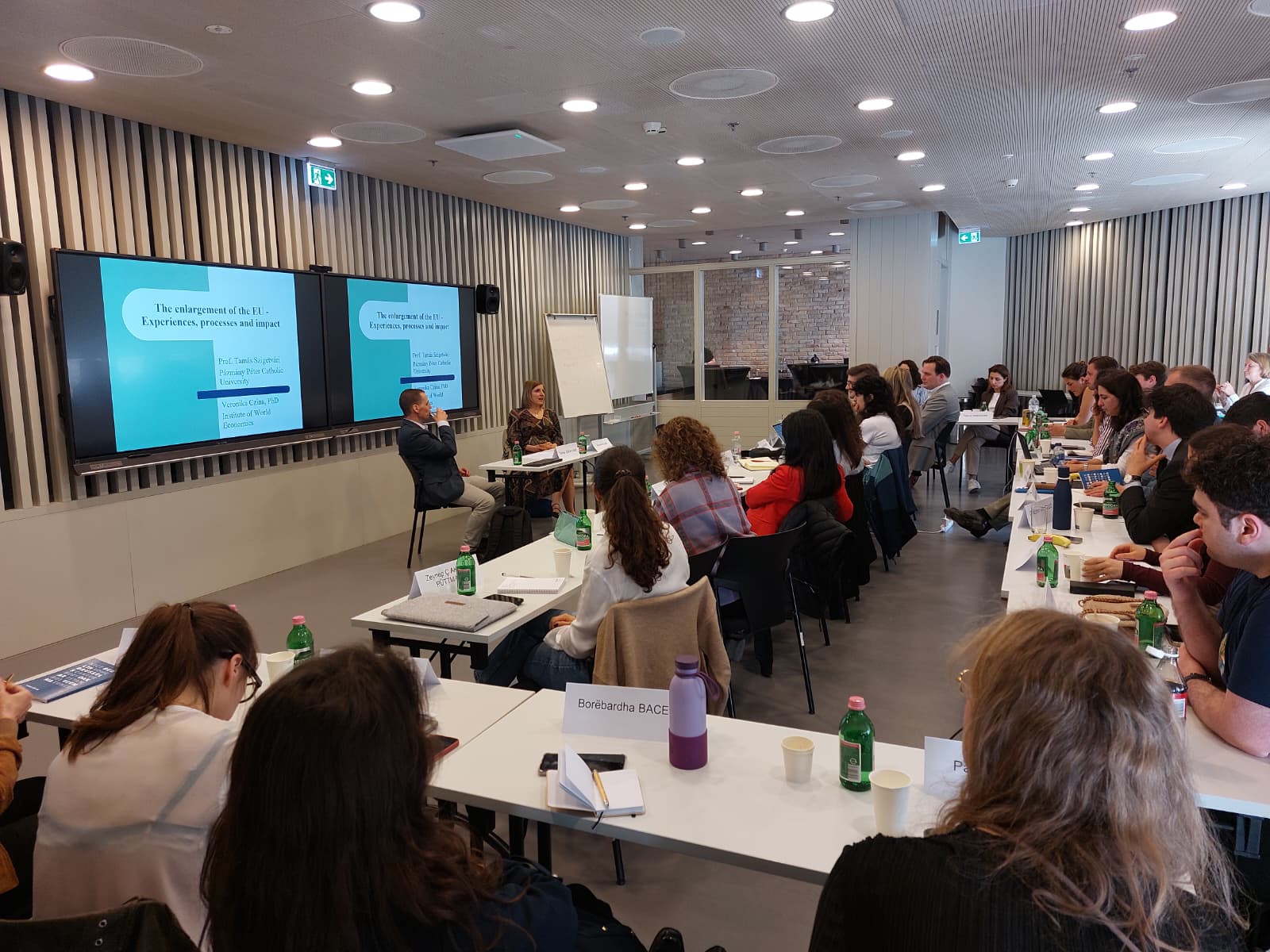 In a well-lit classroom at the Central European University, students were then introduced to the third term courses on “EU Enlargement – Experiences, Processes and Impact” with Tamás Szigetvári and Veronika Czina; “Justice and Home Affairs in the EU” with Artur Gruszczak; “Lobbying and Advocacy in the EU” with Doris Dialer; and “Sustainable Development and the European Green Deal” with Gyöngyvér Gyene, which featured an interactive resource management simulation based on the concept of the Tragedy of the Commons.